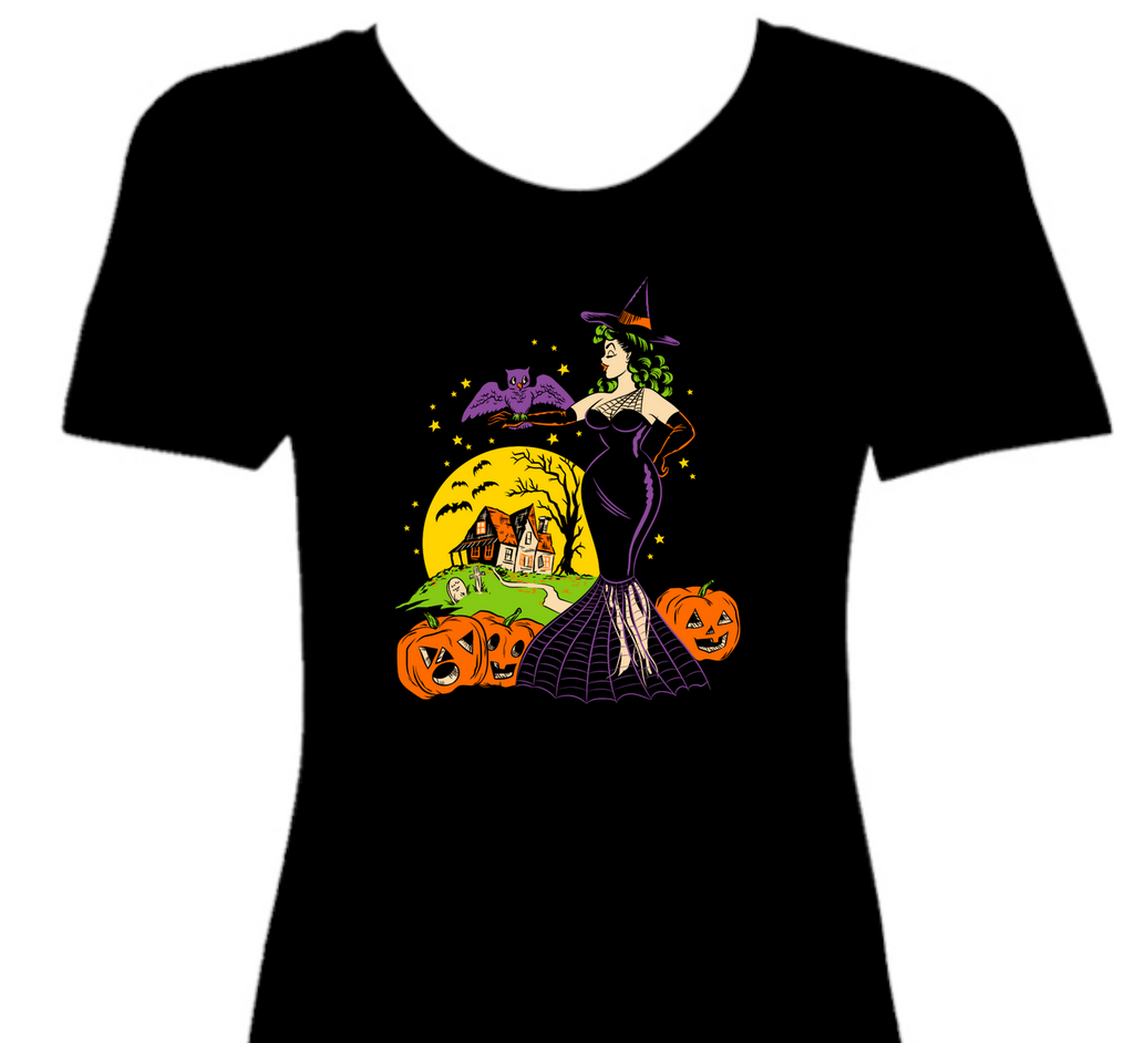 Glamorous Halloween Pinup Witch Black T-Shirt. 100% cotton tee