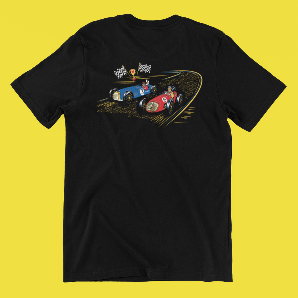 Our Grand Prix Auto Racing Speed Racer T-Shirt is designed for the automotive racing fan and has a fun design of a competitive race with a trophy and checkered flags.