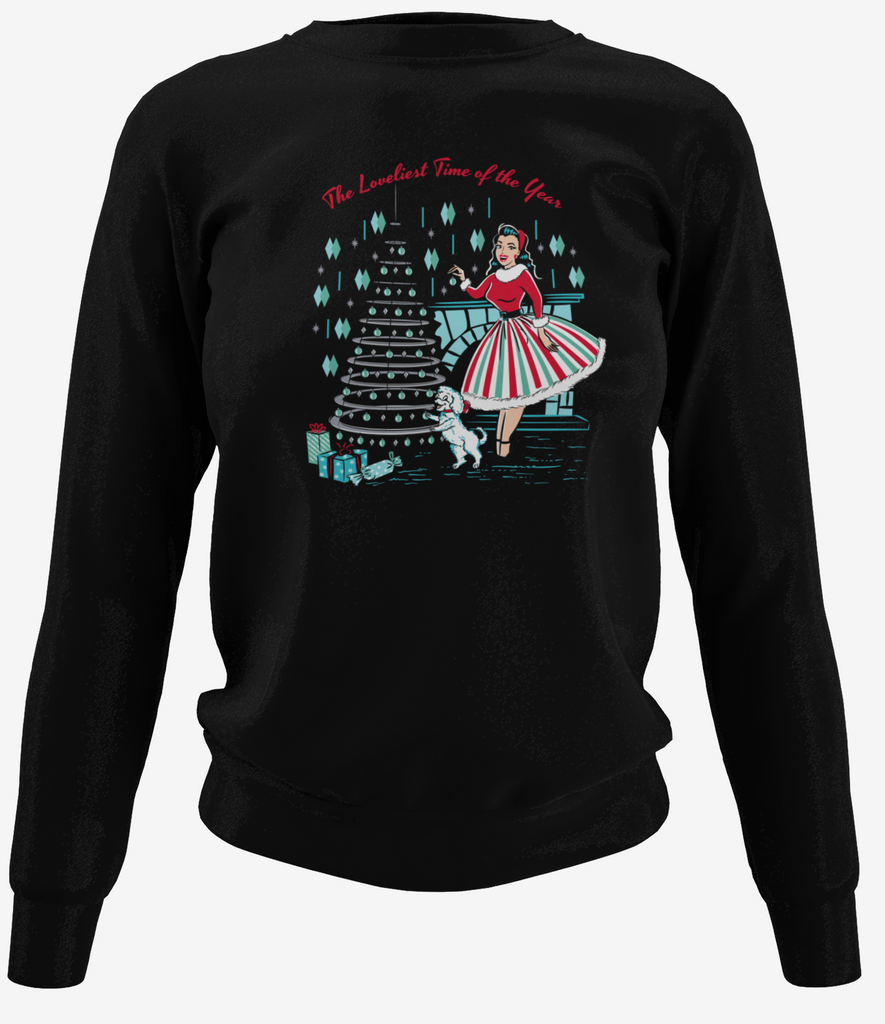 Time to decorate the Christmas tree!! But this isn’t just any Christmas tree, it’s an atomic era Mid-Century Modern Christmas tree with jewel ornaments. There's a lovely lady and her puppy dog making sure the tree is perfectly trimmed. Design is on a 100% cotton black pullover crewneck sweatshirt.