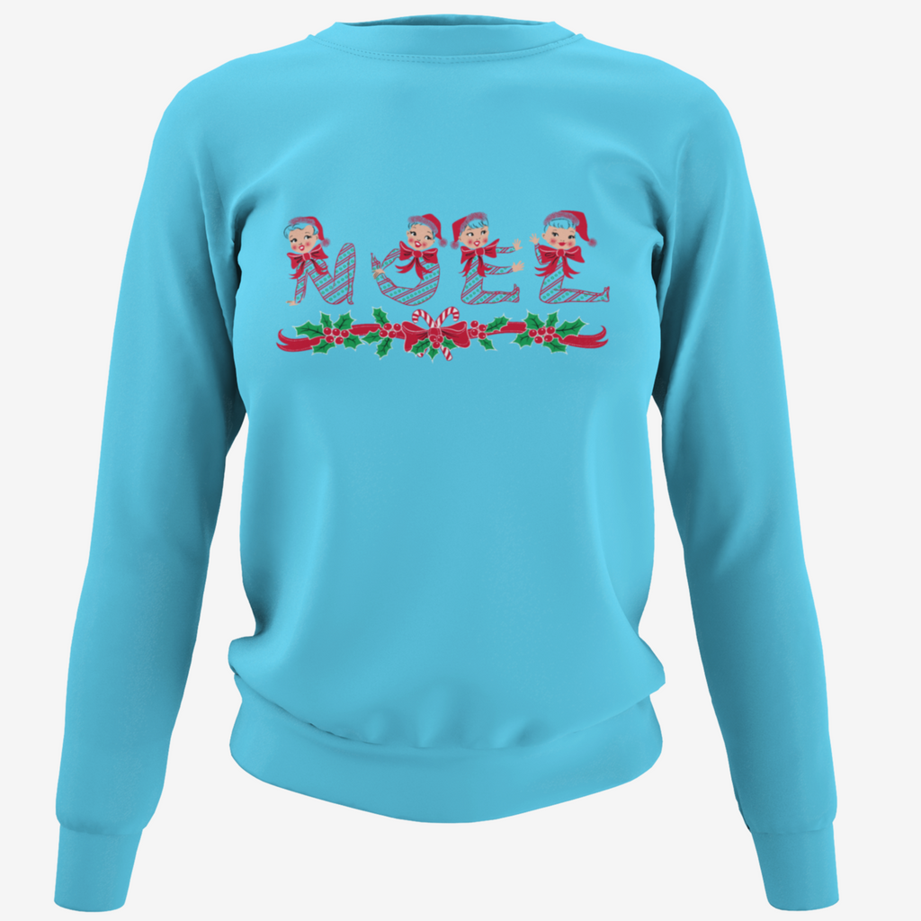 Whimsical NOEL candy cane pixies on a blue sweatshirt.