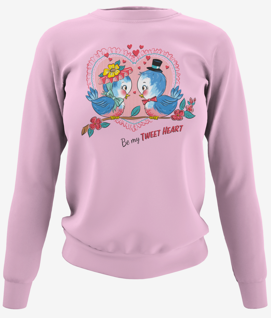 Darling and cozy, sweet pink crewneck sweatshirt with two bluebirds or Love Birds that are reminiscent of vintage Valentine's Day cards from the 1950s and says "Be My Tweet Heart". Perfect for Valentine's Day and any day!!