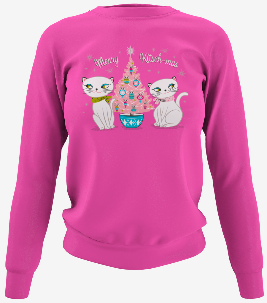 If you collect Holt-Howard Cozy Kittens ceramics or are a cat lover, you will enjoy our newest holiday design featuring two whimsical Cozy Kittens with their fabulous Mid-Century kitschy pink Christmas tree that is in a Pyrex tree stand on a sugar plum pink crewneck sweatshirt full of atomic starbursts. This one is a must for the collector and cat lover!!