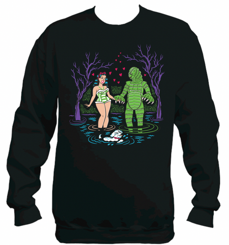 Our Creature From The Black Lagoon sweatshirt just screams swamp romance and couple goals. The creature and his lovely lady are in love and gaze into each other’s eyes. Creature love indeed!! Sweatshirt has a fun custom design and is very soft and comfortable for everyday wearing.
