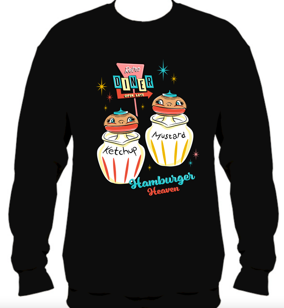 Our Retro Diner Hamburger Heaven retro diner sweatshirt is full of 1950s atomic nostalgia with a cute pair of hamburger head mustard and ketchup Holt-Howard Pixieware jars. This sweatshirt is perfect for the cooler months and is available in UNISEX sizing.