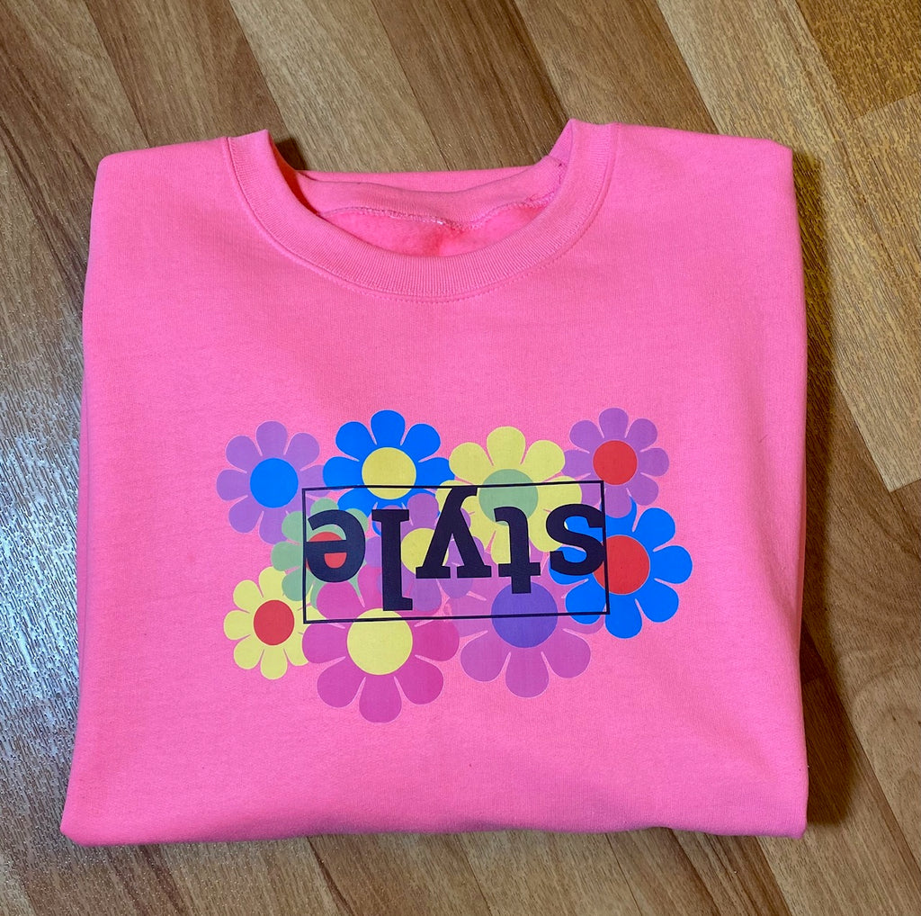 This bright pink super soft unisex sweatshirt has colorful flowers with "Style" in a box logo on the front. Sweatshirt runs big and is cozy comfy with a soft fleece interior for everyday wear.