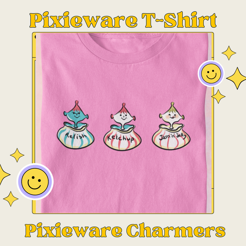Put a little 1950s zing into your wardrobe with our Pixieware t-shirt TRIO charmers. These whimsical 1950s-1960s Pixieware characters are so much fun and each has such a unique face. Our tee features the adorable Jam ’n Jelly Pixieware charmer with his little red tongue licking the sweet jelly residue from his lips, there's the Ketchup Pixieware charmer with a big warm smile, and the fabulous Relish jar Pixieware charmer with his diamond-shaped head and retro blue color. All three Pixieware charmers on a pink ladies tee and it looks dynamite!!