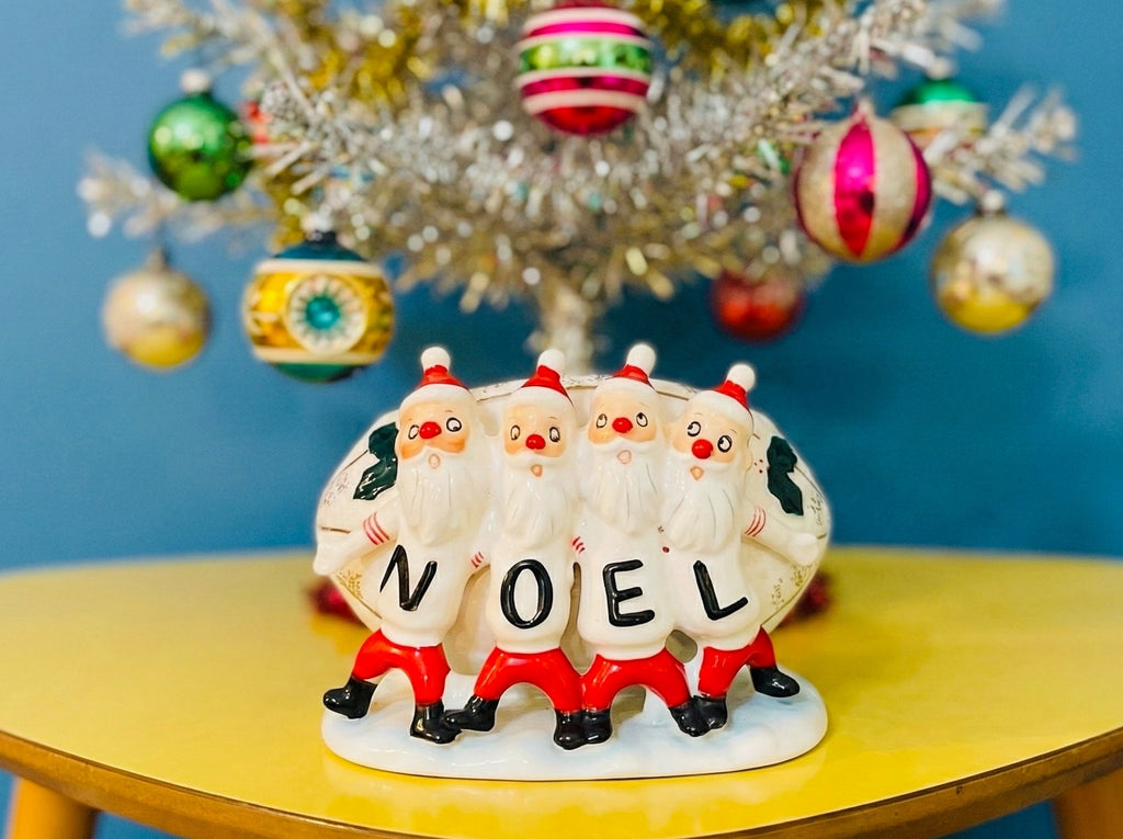 Get ready for touchdown-level cuteness! This incredibly spectacular, very VERY rare 1960 Relpo ceramic planter features a whole squad of football-playing Santas lined up in formation, proudly spelling out NOEL as they cheer from the front of a fabulously football-shaped planter. It’s the kind of mid-century treasure that makes collectors gasp and elves faint!